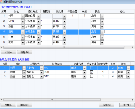 系統提供條碼解析規則功能,可以對二維碼在系統內設定分短提取規則。也可以對定義不規范的條碼進行去前后綴處理(如前面包含“PN:”或者后面包含“(PCS)”等),或者僅截取中間某段有效字符.