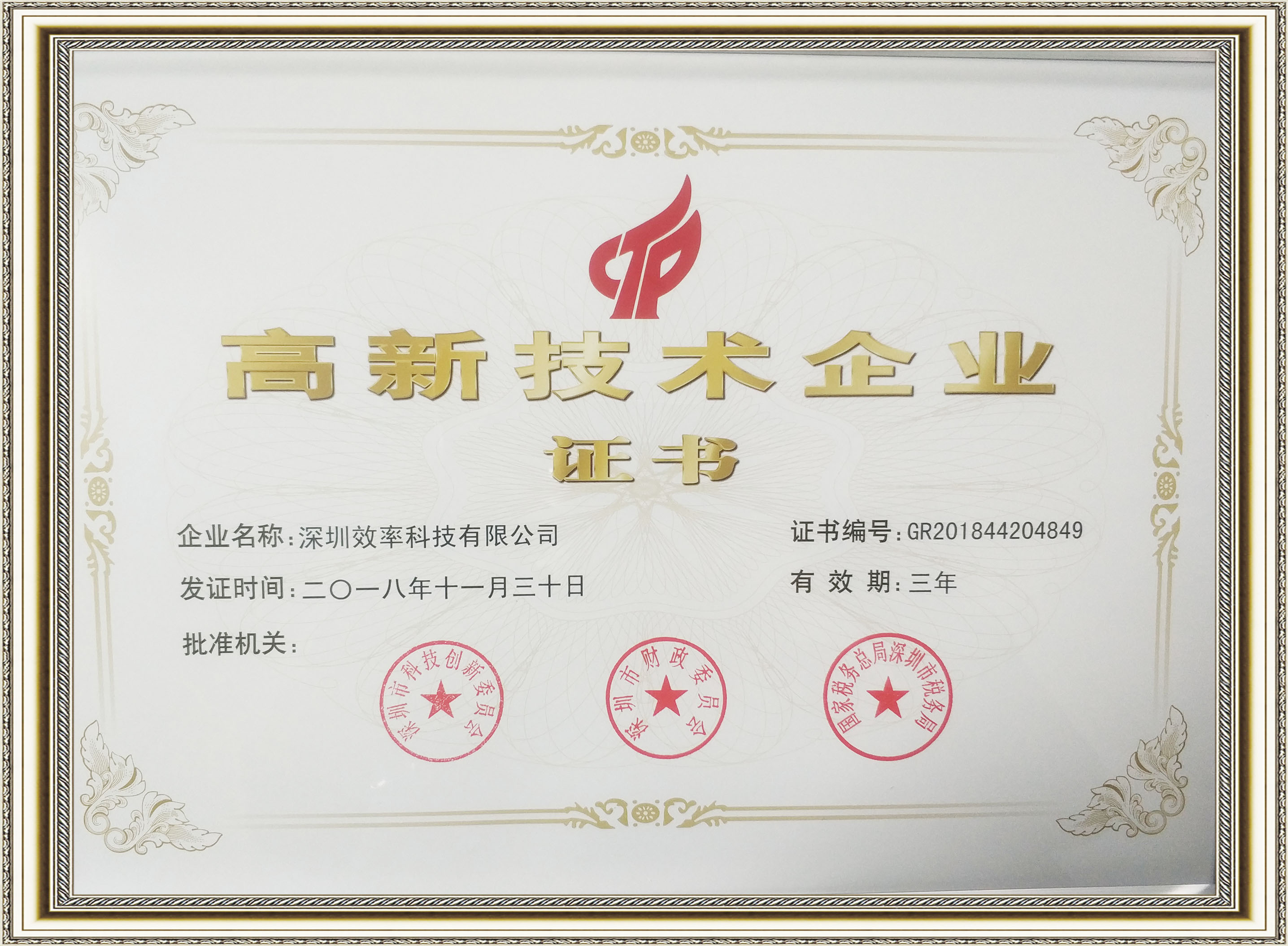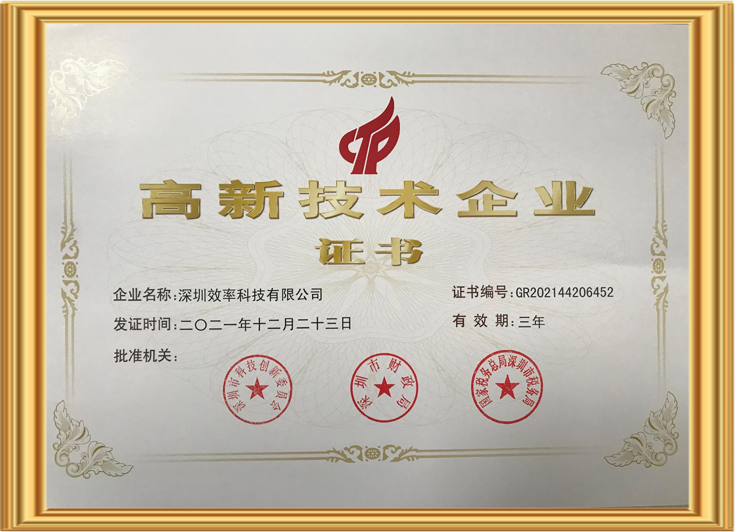 國家高新技術企業證書