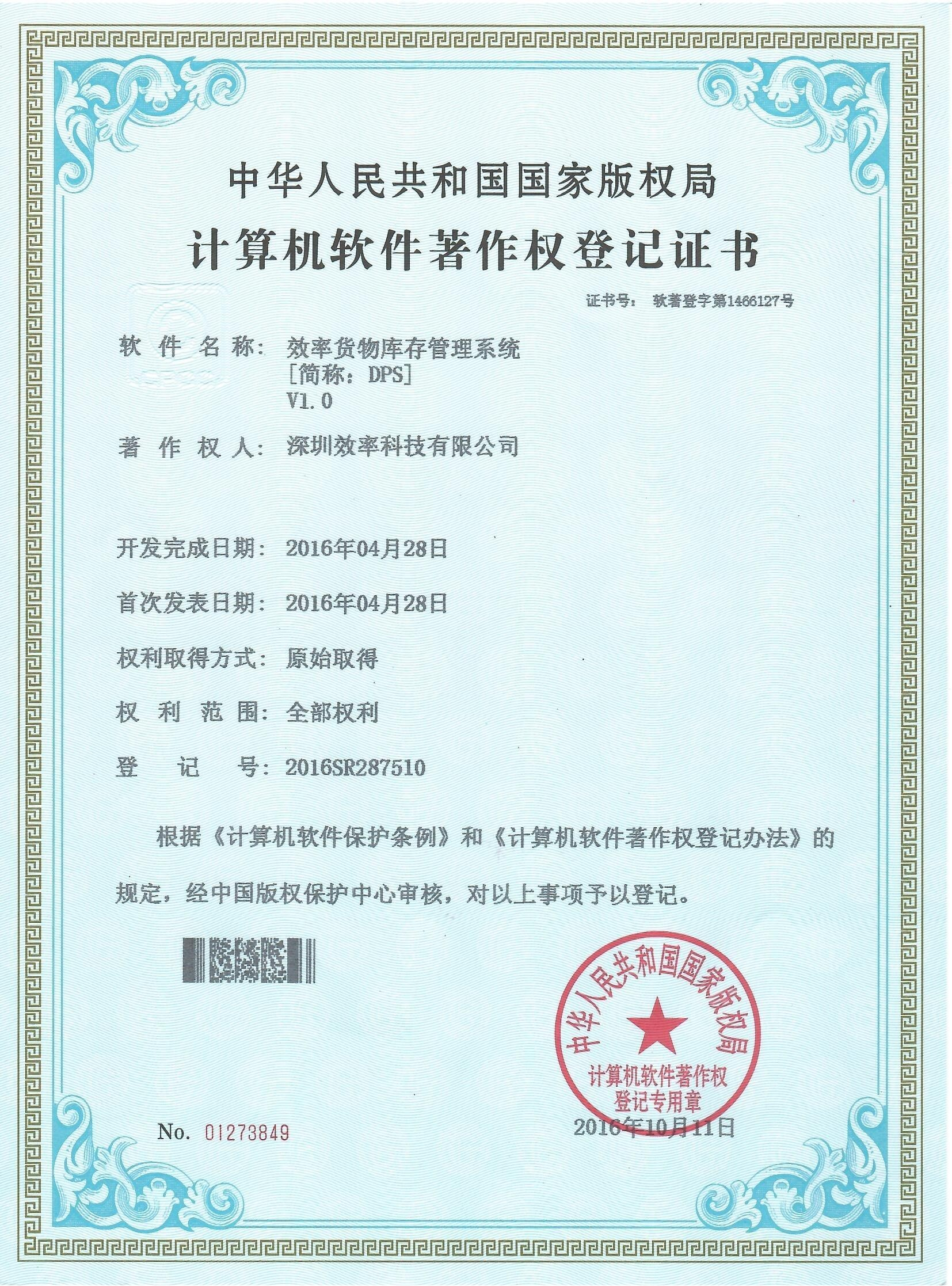 DPS貨物庫存管理系統軟著證書