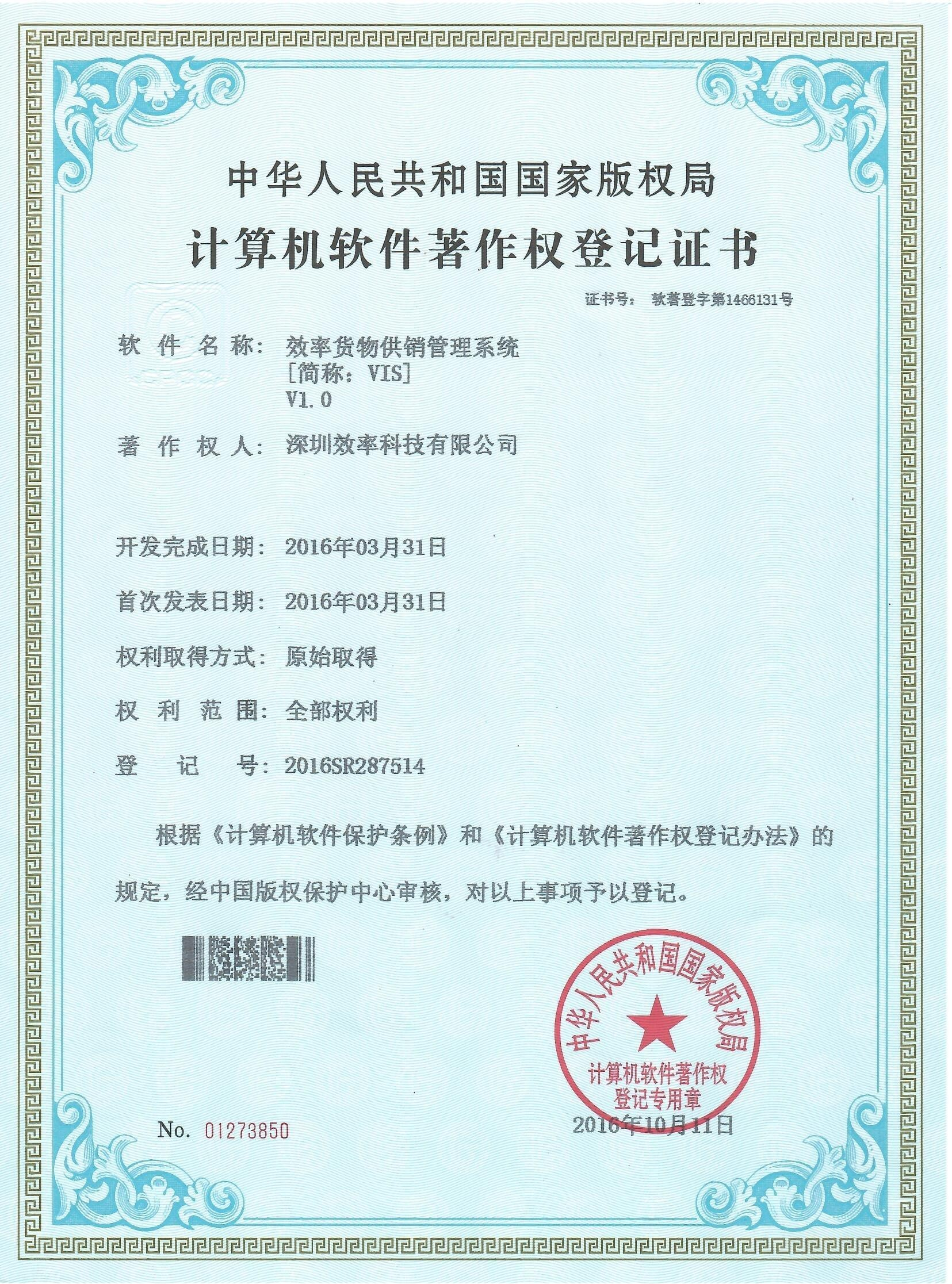 VIS貨物供銷系統軟著證書