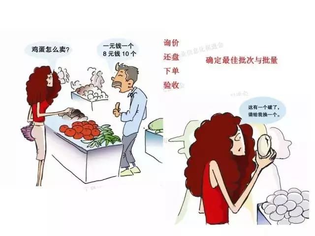 來到自由市場,妻子:“請問雞蛋怎么賣?”(采購詢價)小販:“1個1元,8塊錢10個。”妻子:“我只需要8個,但這次買1打。”(經濟批量采購)妻子:“這有一個壞的,換一個。”(驗收、退料、換料)
